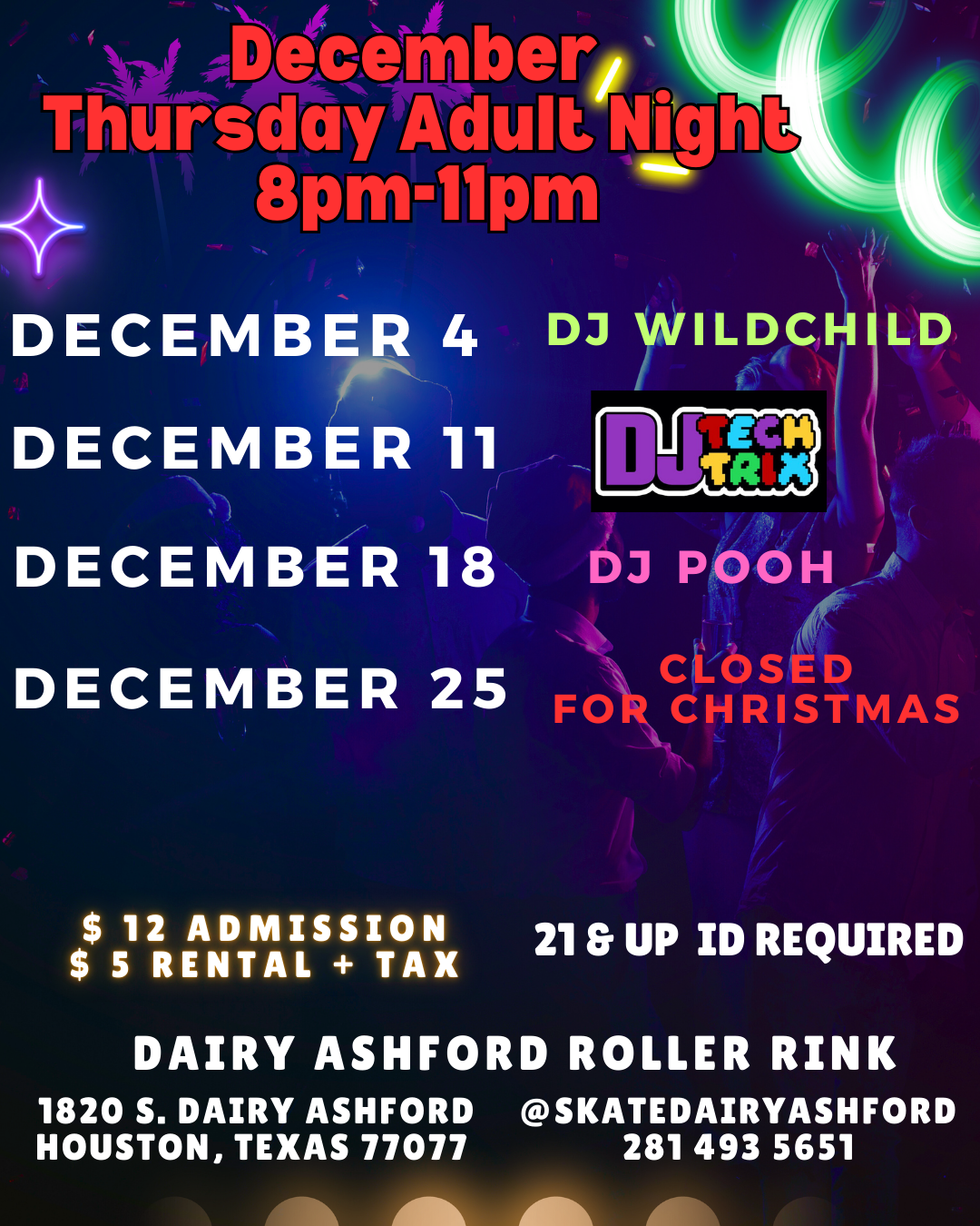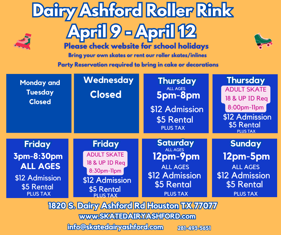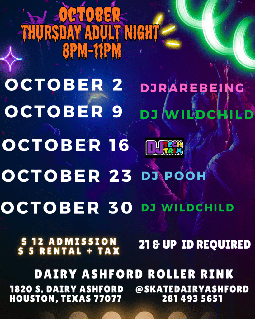 At Dairy Ashford Roller Rink, we love celebrating special occasions. Join us for birthday parties or other events and create memories that will last a lifetime. Our themed weekly events are a hit with guests of all ages – from holiday celebrations and glow parties to adult skates. Come dressed up and enjoy a unique night out with your friends and family.