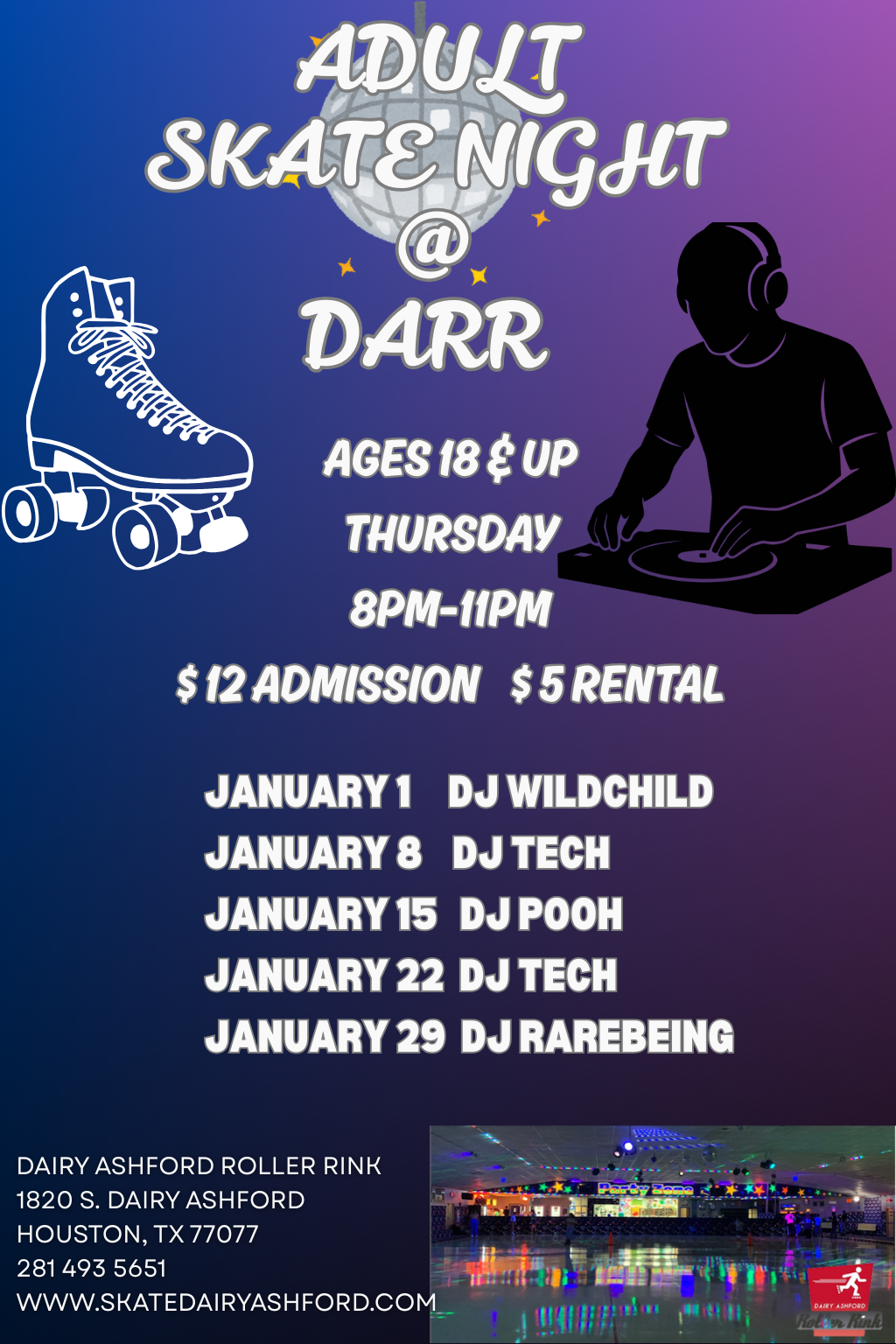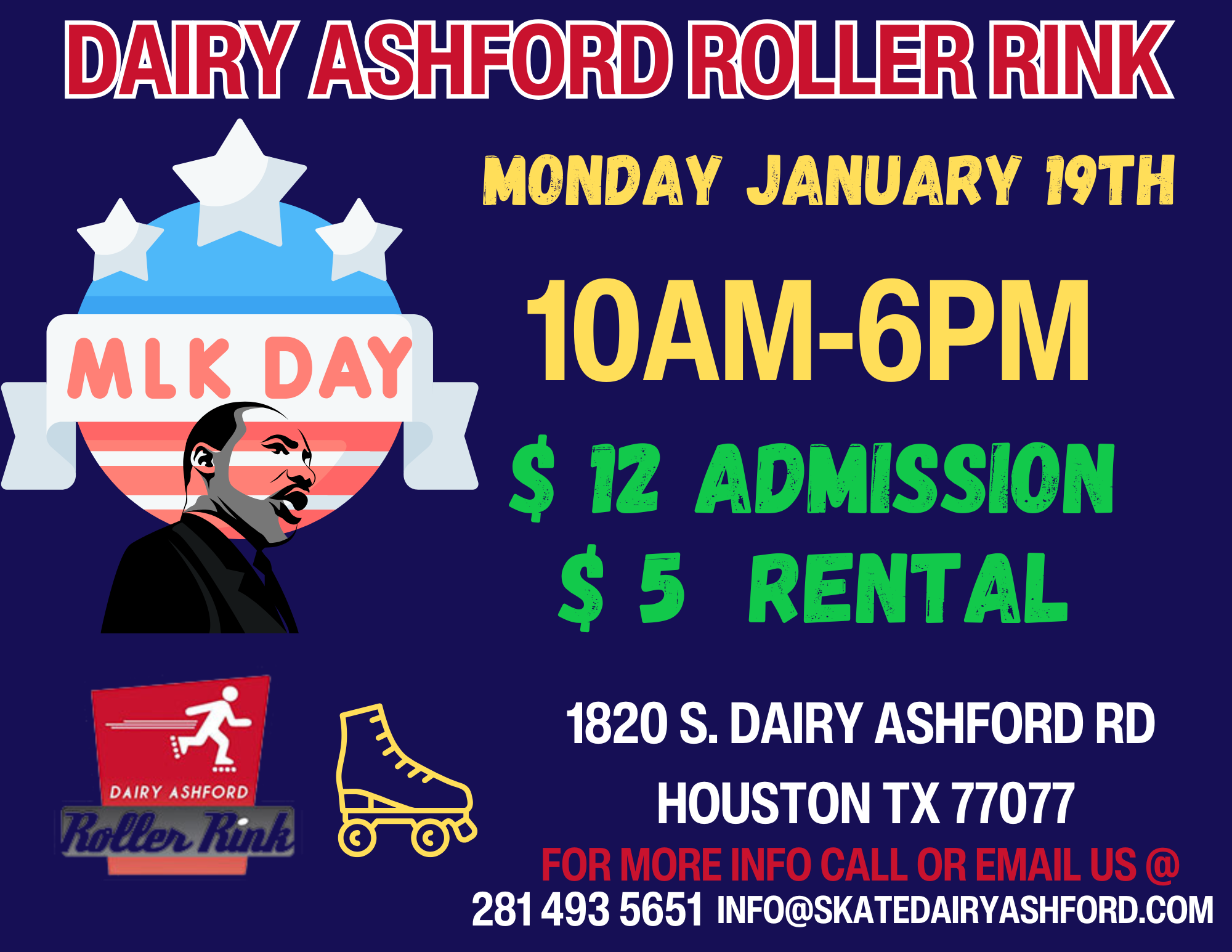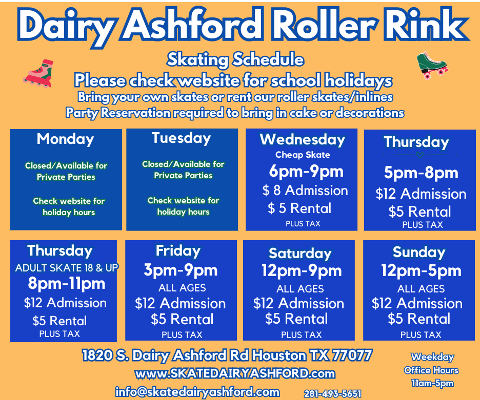 Rules and Dress Code Online Job Application Book Online Adult Skate Waivers – REQUIRED! Phone:281-493-5651 1820 South Dairy AshfordHouston, Texas 77077 Home About Us Gallery Exercise Benefits of Roller Skating Contact us Hours & Prices Events & Planning Book Your Party Online Party Packages FAQ’s Event Inquiry Create Guest List Private Parties Schools School Field Trips School Fundraisers Home School Skate Disney Hits 10&U skate Upcoming Events Skate Waivers - REQURIED! Home About Us Gallery Exercise Benefits of Roller Skating Contact us Hours & Prices Events & Planning Book Your Party Online Party Packages FAQ’s Event Inquiry Create Guest List Private Parties Schools School Field Trips School Fundraisers Home School Skate Disney Hits 10&U skate Upcoming Events Phone: 281-493-5651 Rules and Dress Code Online Job Application Class Waivers Upcoming Events